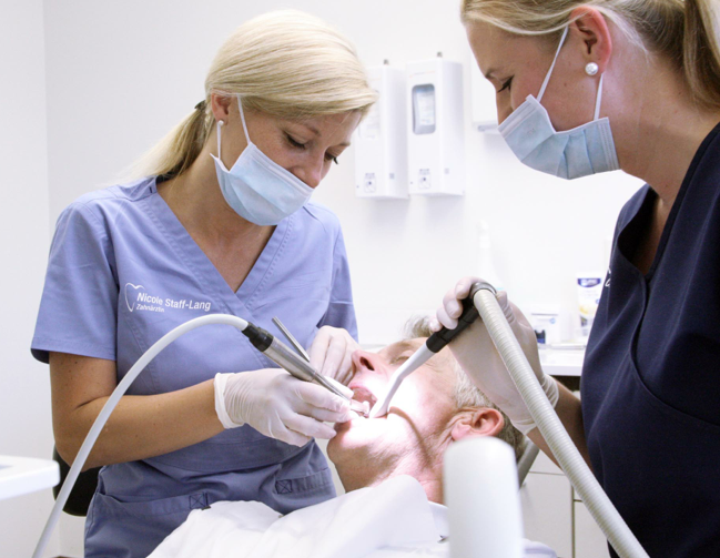 Mundhöhle im Vordergrund. Sind Behandlungen an Zähnen oder Zahnfleisch dennoch nötig, so bevorzugen wir schonende